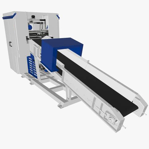 Исходный материал укладывается на ленточный конвейер, по которому транспортируется к прижимным и подающему роликам. Ролики немного уплотняют и подают сырье на стационарный нож. Подвижный нож, двигающийся сверху вниз отрезает полосу сырья и сбрасывает ее вперед на лоток выгрузки. Регулировка ширины отрезаемого материала регулируется скоростью ленточного транспортера и роликов.